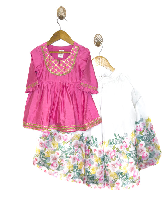 White and Pink Floral Chanderi Gharara Set