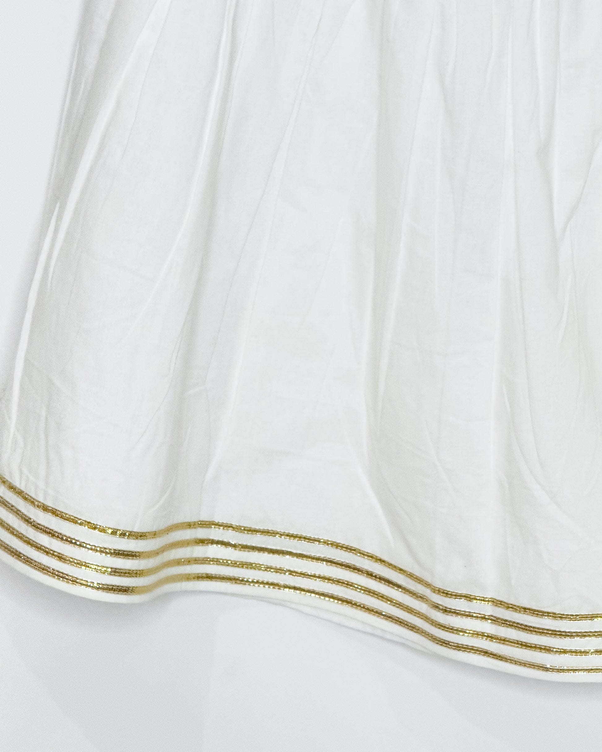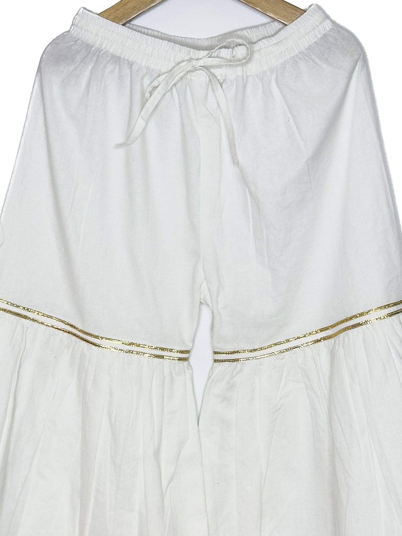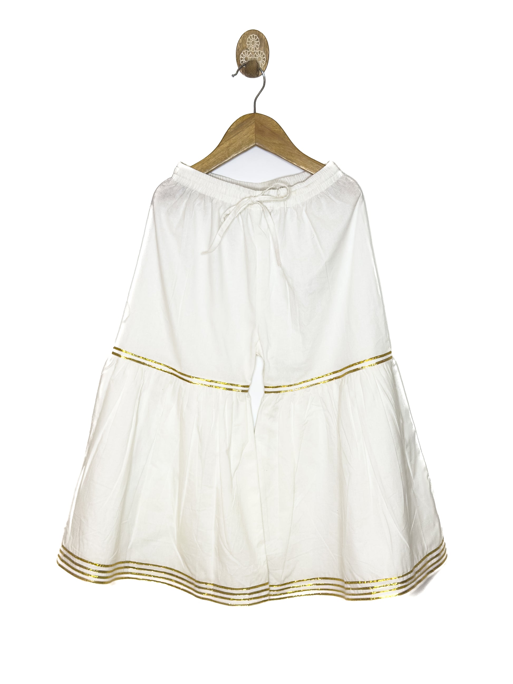 The set features delicate gota work, lace detailing and playful detail that add just the right amount of festive sparkle. Paired with a off-white plazo, this ensemble is perfect for Diwali, Raksha Bandhan, weddings, family get-togethers, and special occasions.