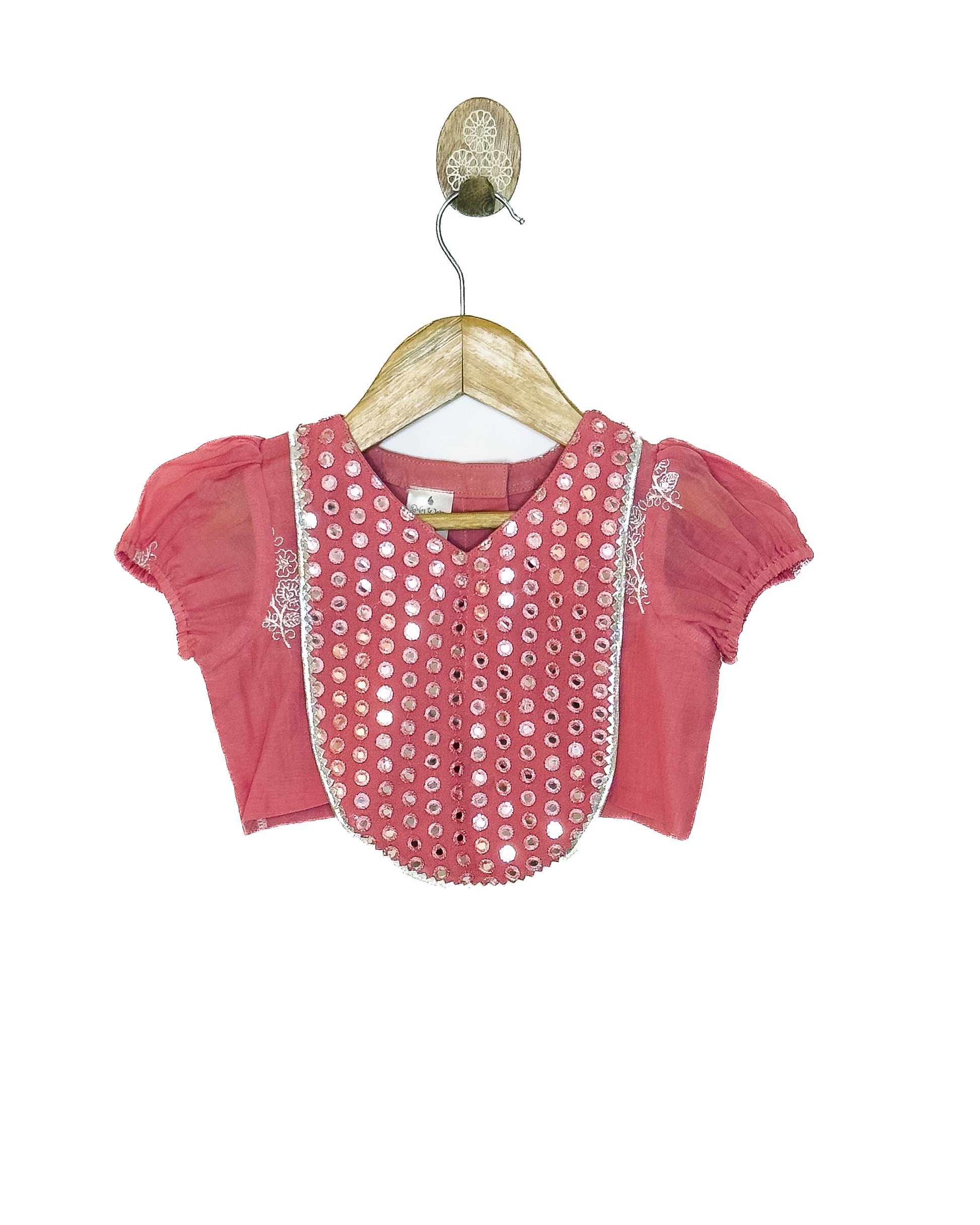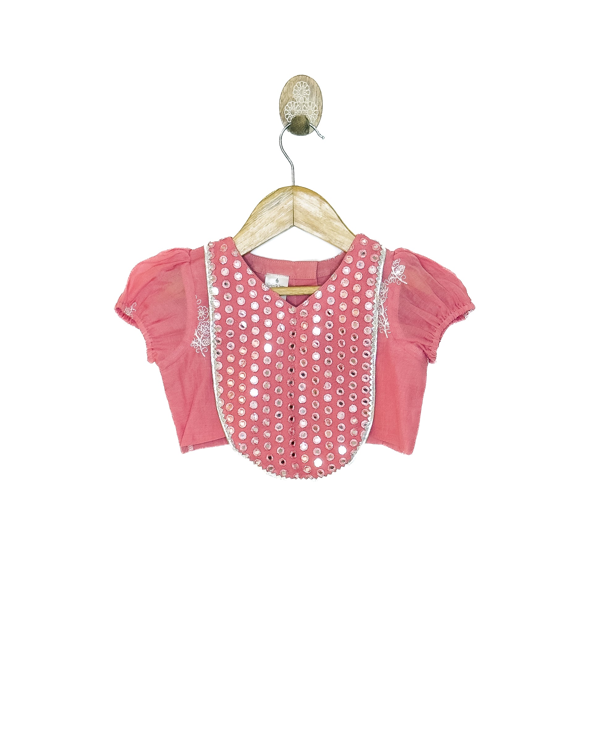 The set features mirror patchwork and playful detail that add just the right amount of festive sparkle. Paired with a off-white plazo, this ensemble is perfect for Diwali, Raksha Bandhan, weddings, family get-togethers, and special occasions.