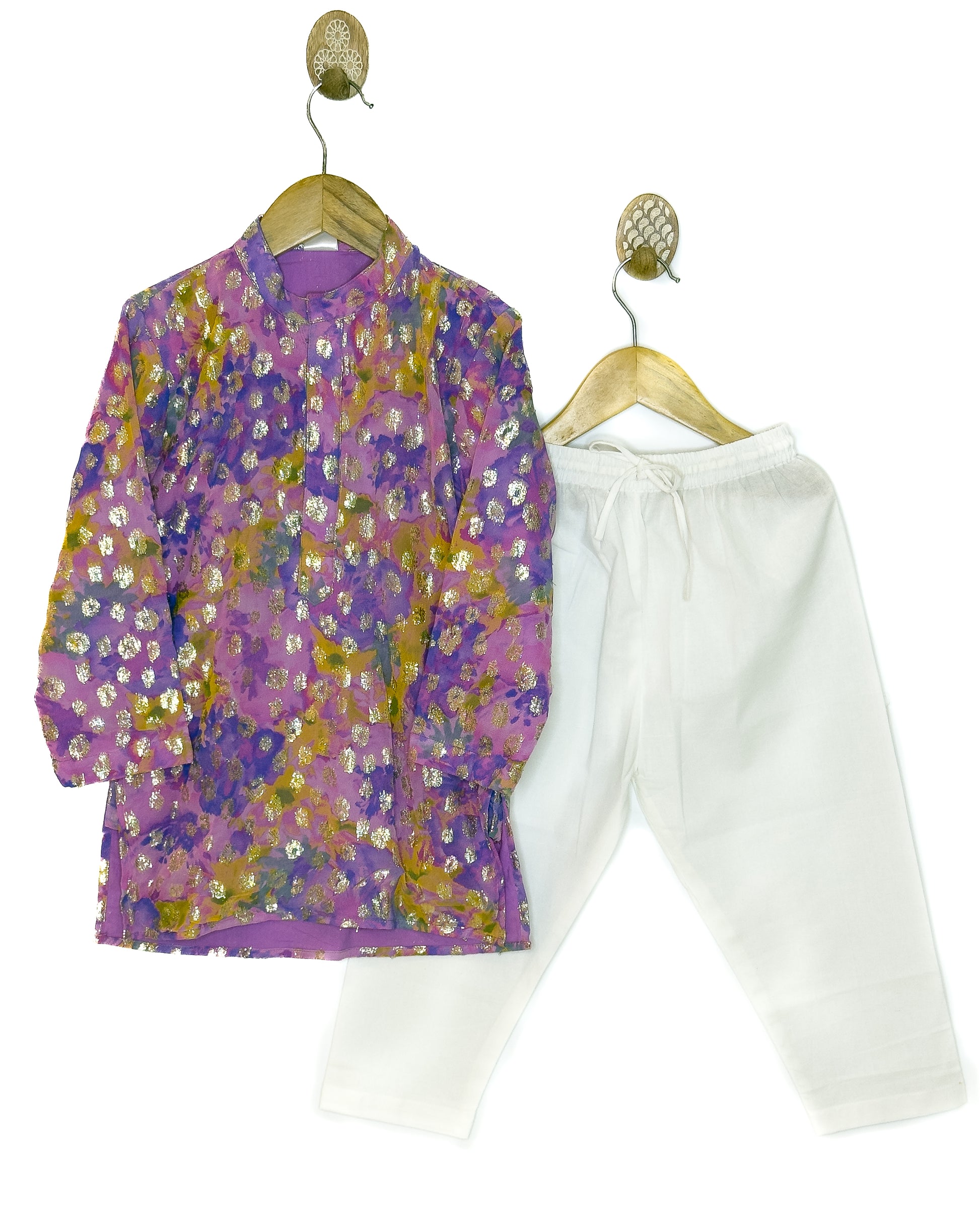 Dress your little one in timeless elegance with our pure Luxe Georgette Jacquard kurta and pyjama set, designed especially for the upcoming festive season. Made from 100% pure high-quality Mul Chanderi lined with pure voil cotton, this outfit is ultra-soft, breathable, and gentle on your child’s delicate skin—perfect for long celebrations and joyful moments.
